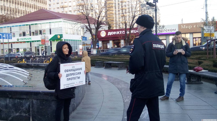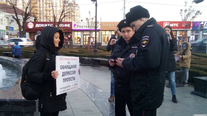 «Чего вы хотите этим добиться?» — в Краснодаре полицейские удивились одиночному пикету против закона о повышении пенсионного возраста. Об этом 4 ноября сообщает корреспондент ИА Красная Весна.