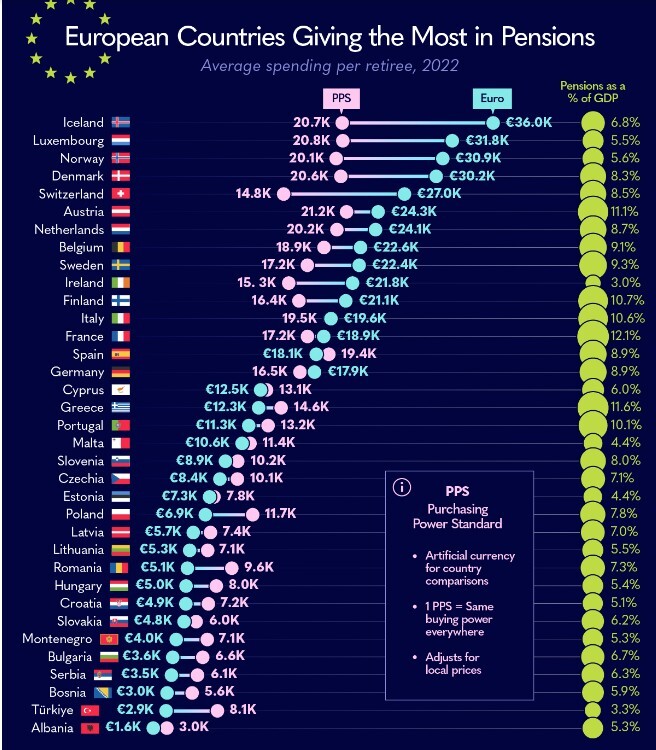 Дизайнеры-аналитики Visual Capitalist собрали статистику по очень возрастной теме и выстроили рейтинг: «Европейские страны с лучшими пенсиями по старости». Подробней публикуем первые строки, дальше сами по ссылке, если интересно.
