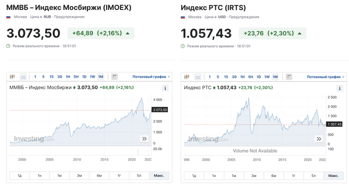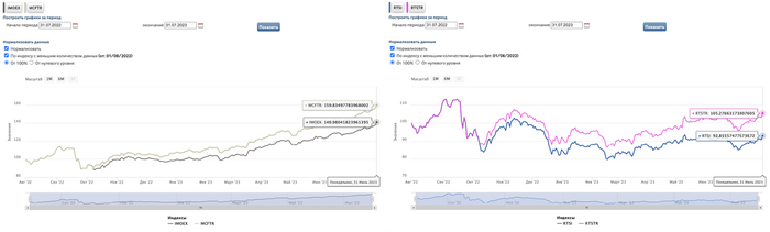 А вот графики индексов Мосбиржи и РТС и они же брутто (с дивидендами) ровно за год на процентной шкале: