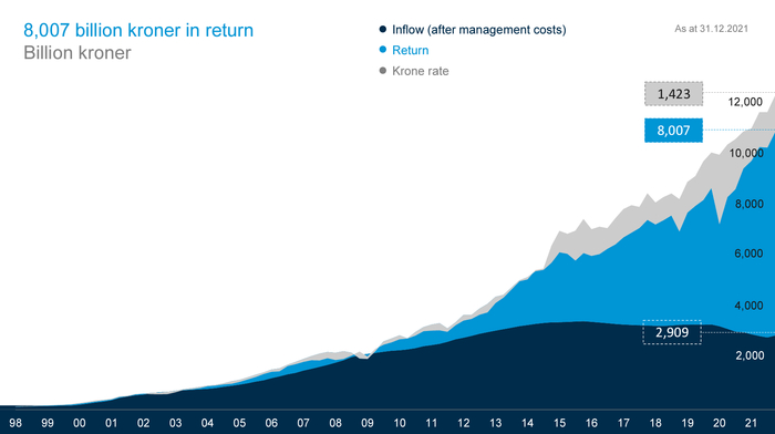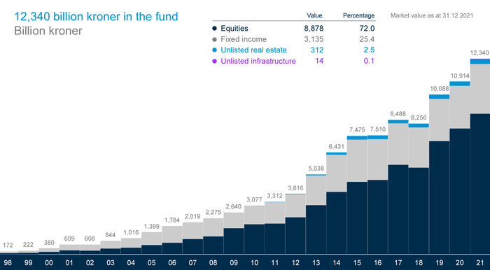По состоянию на конец 2021 года активы норвежского пенсионного фонда составляли уже 12 триллионов 340 миллиардов крон или порядка 1,4 трлн долларов.