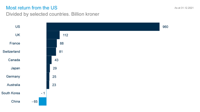 Фонд инвестирует по всему миру. Даже в Россию. К сожалению, ещё не представлены данные за 2021 год, но в 2020 году норвежские пенсионеры владели небольшими долями в 50 наших компаниях на сумму свыше 30 млрд норвежских крон (260 млрд ₽) - от Сбербанка и Яндекса до Саратовского НПЗ (Крекинг) и Башнефти. Но по абсолютным показателям наибольший вклад в доходность в 2021 году принесли американские корпорации - 960 млрд крон (8,4 трлн ₽).