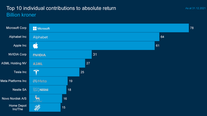Что это за корпорации - тоже не секрет. Больше всего денег норвежским пенсионерам в 2021 принес Microsoft - 78 млрд крон (680 млрд ₽).