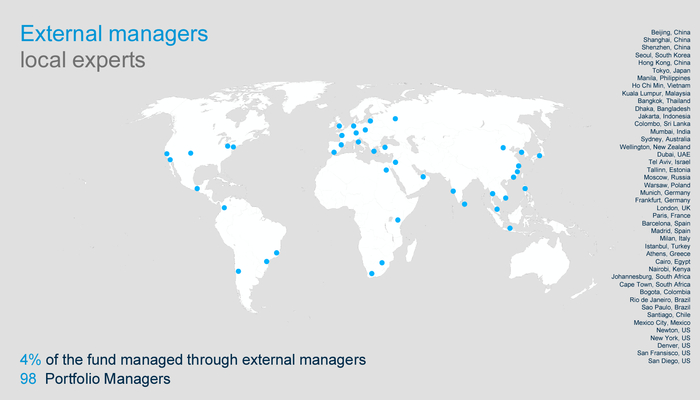 Так как Норвегия - страна маленькая, им приходится открывать офисы в разных странах и нанимать местных экспертов для того чтобы понять, а куда можно инвестировать. Так, сейчас 98 менеджеров по всему миру управляют 4% фонда, но цифра отданного на аутсорс управления сильно растет. Например, у норвежских пенсионеров есть офис в Москве, в задачи которого входит анализ российского фондового рынка с точки зрения привлекательности инвестиций и соблюдения ценностей фонда.