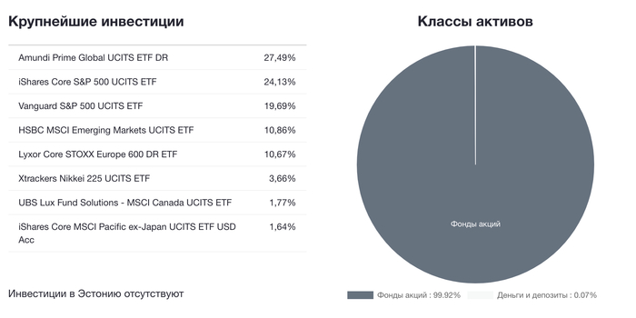 Интересный факт: большинство активов сейчас - это акции компаний со всего мира. В акциях сконцентрировано 72% от стоимости активов фонда (синий цвет на графике). Несмотря на сложившийся среди обывателей стереотип, что эти все акции - это циферки и графики на экранах, и ничего из себя не представляют и вообще рынок акций похож на казино, действительно "умные" и крупные деньги делают долгосрочную ставку на них.