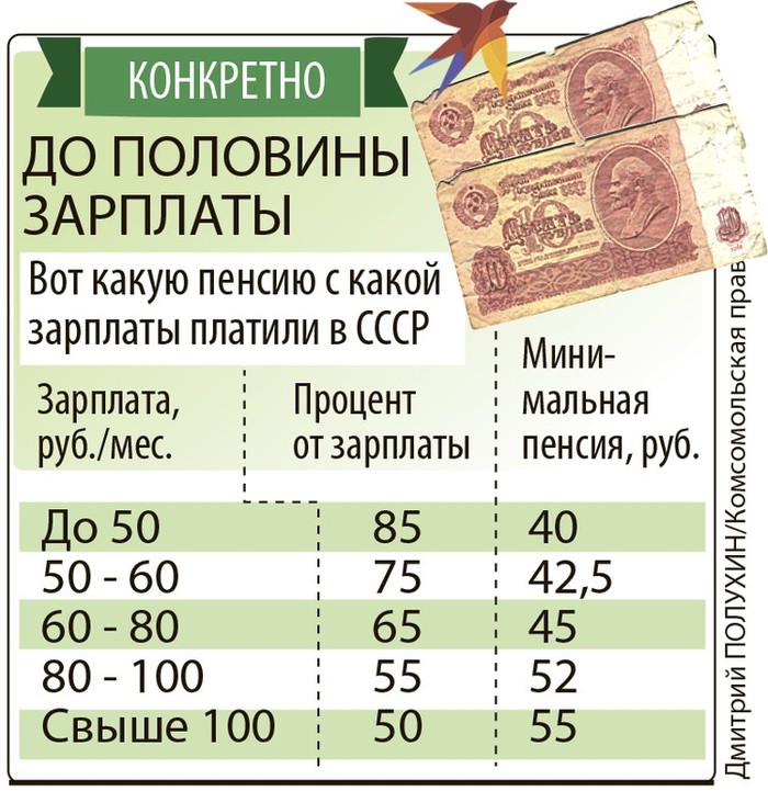 Закон «О государственных пенсиях» был принят в 1956 году при Хрущеве и с тех пор постоянно обновлялся практически до последних дней СССР. Для расчета пенсии учитывались все виды заработка, на которые начислялись страховые взносы, не засчитывались только сверхурочные, совместительство и разовые выплаты. Полновесная пенсия выплачивалась мужчинам, отработавшим не менее 25 лет, и женщинам, которые отпахали не менее 20. Возраст - 60 лет для мужчин и 55 для женщин.
