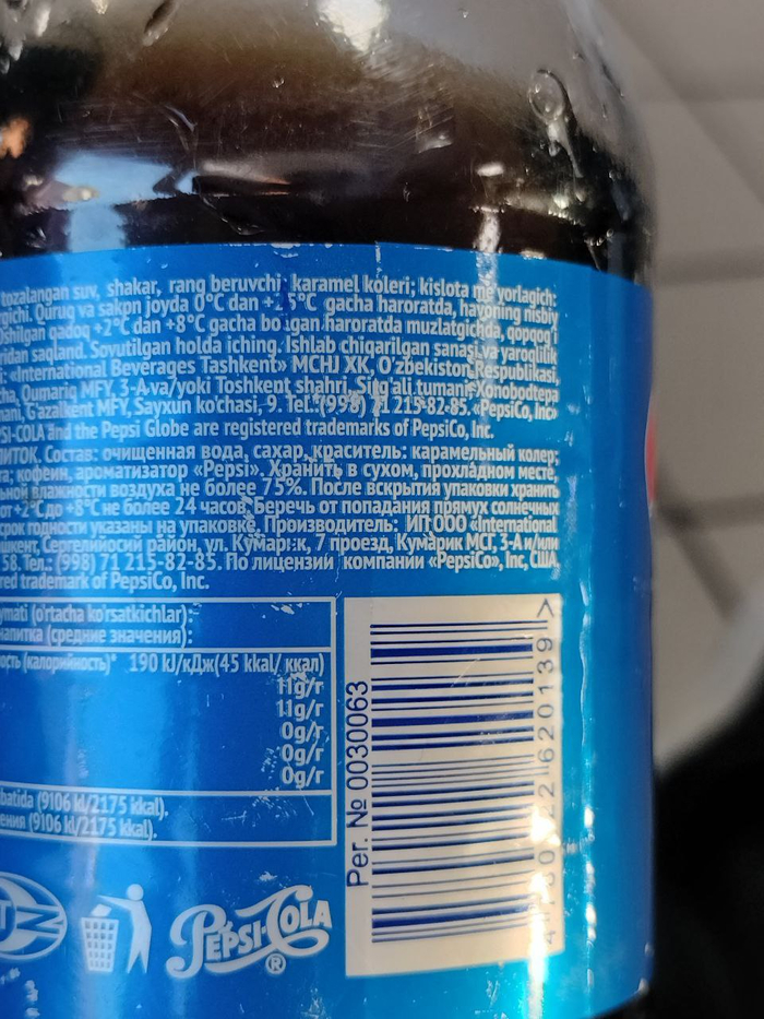 Пепси, Колу я крайне редко пью, поэтому по вкусу не могу понять оригинал или нет, но вкус какой-то беспонтовый, я бы сказал. Сама бутылка и этикетка потёртые, от напитка стойкий запах как если соду гасить уксусом. Тем не менее на крышке был qr-код Честного знака. Его что-то не подумал сфотать.