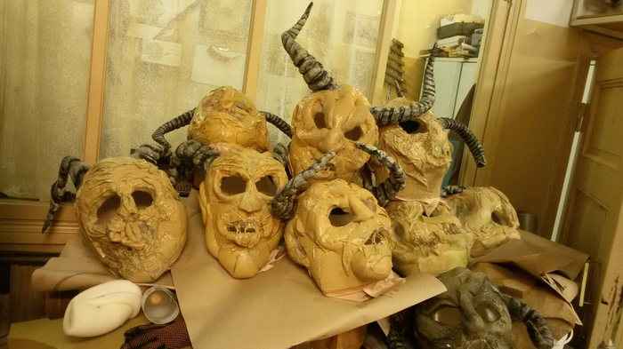Немного о масках: сделаны из поролона, в основном. Рога из Ева-пены. Маски и костюмы украшены нитками, кусочками ткани, синтепоном и чем только не. Покрыты краской странной текстуры и латексом искусственным.