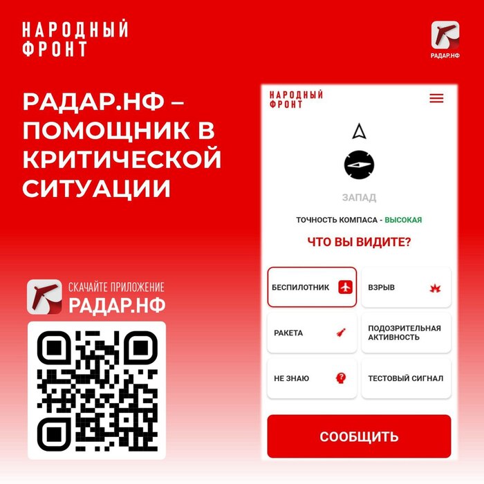 С помощью приложения "Радар.НФ" вы сможете мгновенно оповестить спецслужбы о воздушной опасности или подозрительном предмете. Ваша безопасность – в ваших руках и вашем телефоне! Все актуальные способы установки размещены здесь.