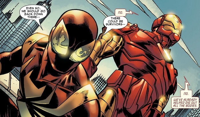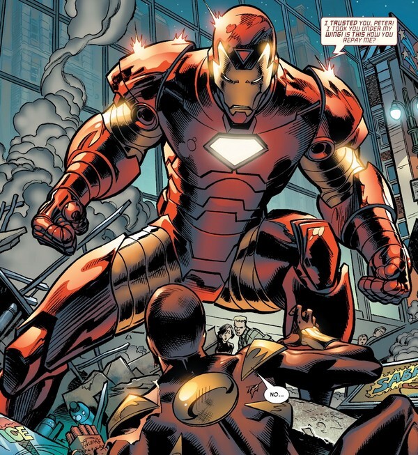 Стенолаз испытывает новый костюм на гопниках, угнавших автомобиль и собравшихся порешить его владельца, чтобы не оставлять свидетелей. Ну что – подмышечная паутина в качестве глайдера работает, пуленепробиваемость действительно есть, линзы тоже не сбоят. Всё збсики! И Мэри Джейн довольна – костюм обеспечит повышенную выживаемость её мужу. А вот Питер включает подозреваку. “Тони, я, конечно, благодарен... но я тебя знаю. Должен быть подвох. Ты, конечно, филантроп, но не настолько. Тебе же от меня что-то нужно, не так ли?”. Оказывается – да, нужно. Тони уверен, что в супергеройском обществе намечается раскол, и он хочет, чтобы в этом расколе Человек-Паук был на стороне Железного Человека. “Я хочу, чтобы ты стал моим протеже. Абсолютно официально. Чтобы ты ходил за мной, видел, что вижу я. Мне нужна твоя помощь и твоё слово, что что бы ни произошло, ты будешь на моей стороне”. И Питер обещает. Не как киновселенский “Карапуз”, но как уверенный в себе женатый мужчина. “Спасибо, Питер. Теперь собирай чемоданы, мы едем в Вашингтон”.