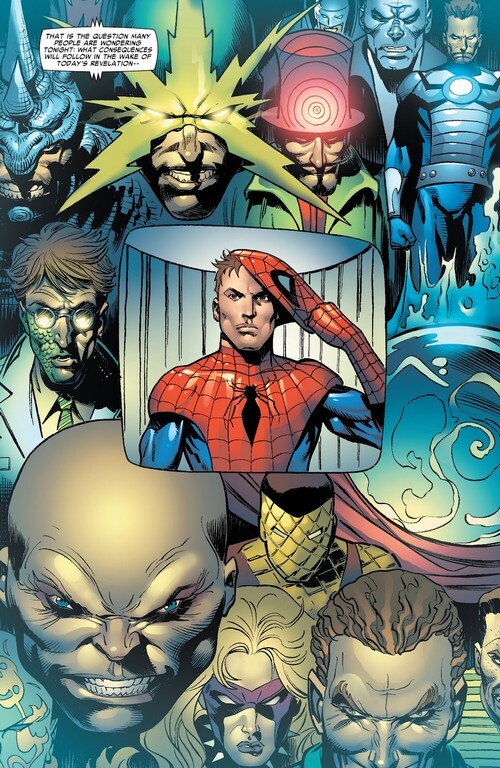 Не мешкая, чешем в комикс Amazing Spider-Man #524 за ноябрь 2005 года, от тех же Стражински и Деодато. Потрясающе, но Человек-Паук жив, хотя уже четырьмя лапками из восьми в могиле. Разбиться об гладь морскую ему не даёт Железный Человек и летит с Питером в башню, приказав подготовить медпункт с вирологическим уклоном. Просыпается Питер через пару дней, слабоватый, но живой, здоровый, и даже не заразный. Тони пытается объяснить, что анализы выявили некоторые аномалии, но Питеру не до этого, главное – повидаться с ЭмДжей. Всё же, Тони настаивает. “В последнее время у тебя не было странных помутнений? Таких, когда ты внезапно терял сознание, или голова кружилась, приступов слабости или неуклюжести?”. И понимает Спайди – были же, были! Но утверждает, что не было. Ну типа, ну закружилась голова, с кем не бывает? Фигня, прошло же, значит, фигня! Ну...ладно. Тони рассказывает, что произошло с базой Гидры. она начала взрываться, и взрывы угрожали людям на поверхности. К тому моменту, как Мстители закончили эвакуацию гражданских, с базы успели свинтить и агенты, и двойники, Ласкомб тоже пропал.
