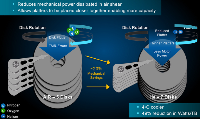 Гелиевые накопители внешне выглядят идентично обычным жёстким дискам. Но только внешне. Нас же интересует то, что внутри. В гелиевых накопителях для хранения информации используются те же физические пластины, что и в жёстких дисках, но герметичный корпус заполнен гелием, а не воздухом. Поскольку гелий в шесть раз менее плотен, чем воздух, то для вращения дисков ему требуется гораздо меньше энергии. Следовательно, он выделяет меньше тепла, поэтому в одном форм-факторе можно разместить больше дисков с большей долговечностью.