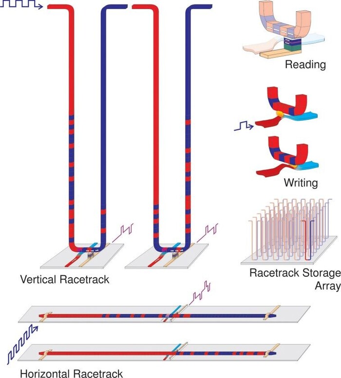 Беговая память обещает лучшее из обоих технологий: носитель данных, который будет таким же быстрым, как флэш-память, но таким же дешёвым, как магнитный, с теоретической ёмкостью хранения, превосходящей оба варианта. Беговая память работает, перемещая не диск, а сами данные. Биты хранятся в субатомных «доменах» между областями магнитного заряда на нанопроволоке шириной в 1/100 000 ширины человеческого волоса. Затем эти домены перемещаются по проводам, как бегуны на беговых дорожках, со скоростью, в 1 миллион раз превышающей скорость магнитных дисков.