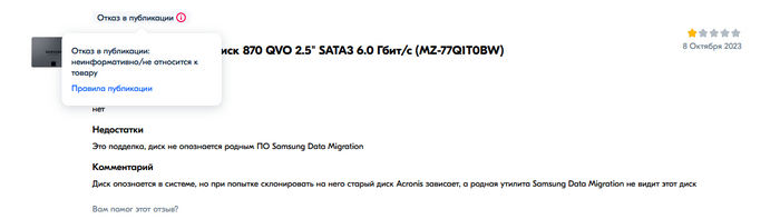 Переписка с поддержкой о том, что это не просто брак, а наглое мошенничество, результатов не дала. Предложение вместо отправки диска продавцу предоставить заключение из сервисного центра Samsung о том, что это не оригинальная продукция тоже было отклонено. Правда мне пообещали, что, когда продавец подтвердит брак, мне вернут и стоимость пересылки. Аргумент, что мошенник вряд ли честно подтвердит брак, а доказательств у меня не останется, т. к. я отправлю диск, тоже не подействовал. Вообще поддержка тупо общается шаблонными ответами и пробить ее невозможно. Рейтинг покупателя их тоже не волнует (а у меня нет ни одного невыкупа и крайне редкие возвраты, когда был реальный брак). Делать нечего, отправил китайцам диск.