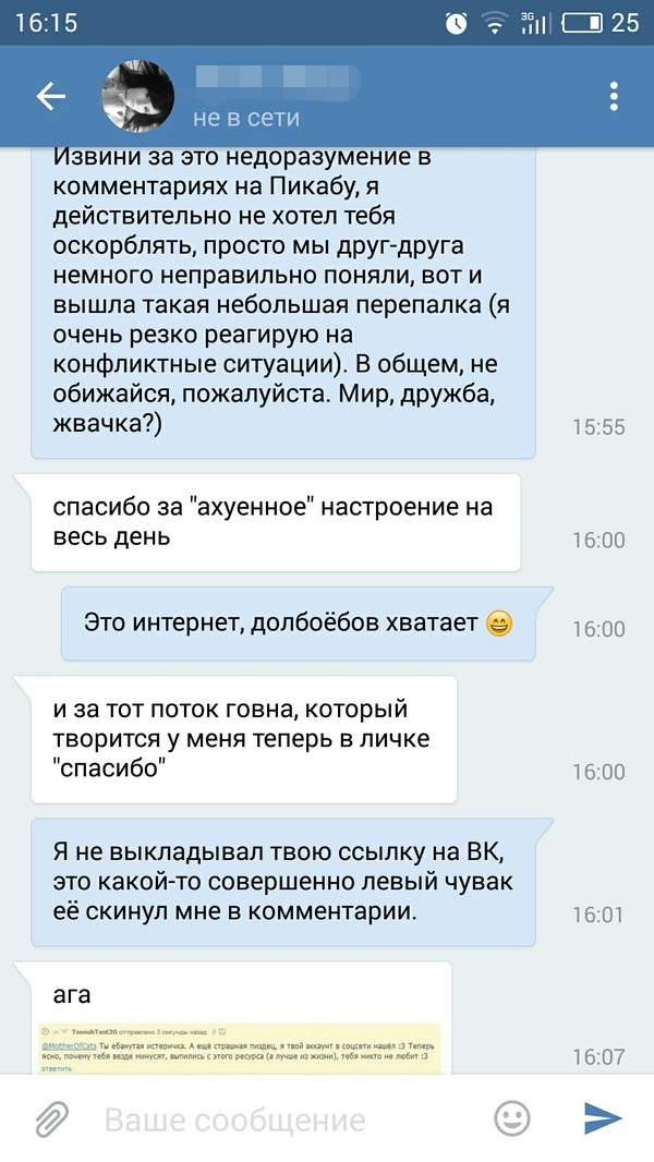 Доброго времени суток, уважаемые пикабушники. Буквально только что я стал участником одной дискуссии в комментариях (ссылка на ветку: #comment_65921229) под топовым постом "Горячего" с девушкой под ником @MotherOfCats. Наша с ней дискуссия закончилась, мягко говоря, на не очень приятной ноте, посему я решил написать ей лично и попросить прощения за это небольшое недоразумение, после чего у меня с ней состоялся следующий диалог: