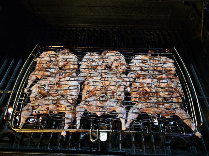 Спустя полтора-два часа разжигаю гриль. Гриль у меня с четыремя горелками, как всегда сначала на полной мощности довожу температру под крышкой до 300-350 градусов, чищу решетки, затем ставлю центральные горелки на середину, оставляя боковые работать на максимум. Перепелки мелкие, поэтому чтобы не шевелить каждую отдельно, я загружаю все шесть тушек в решетку для рыбы