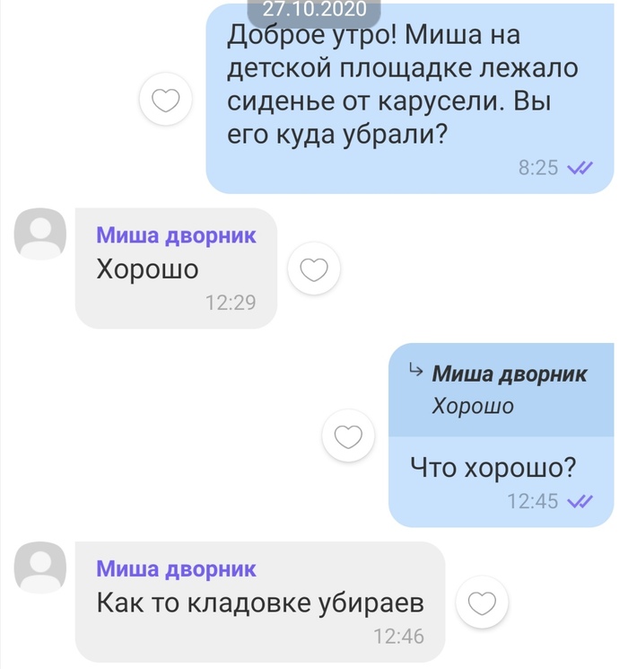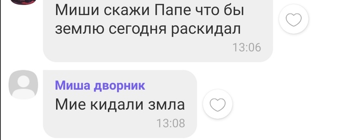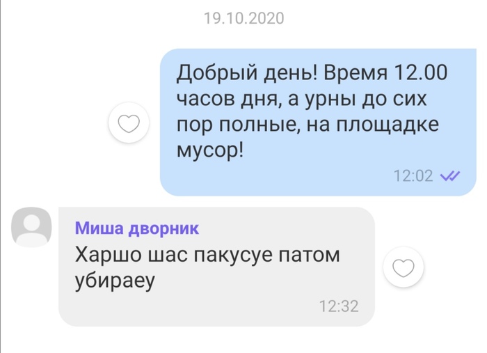 У меня по долгу службы (председатель совета дома) тоже подобные перлы имеются в переписке с дворником-таджиком: