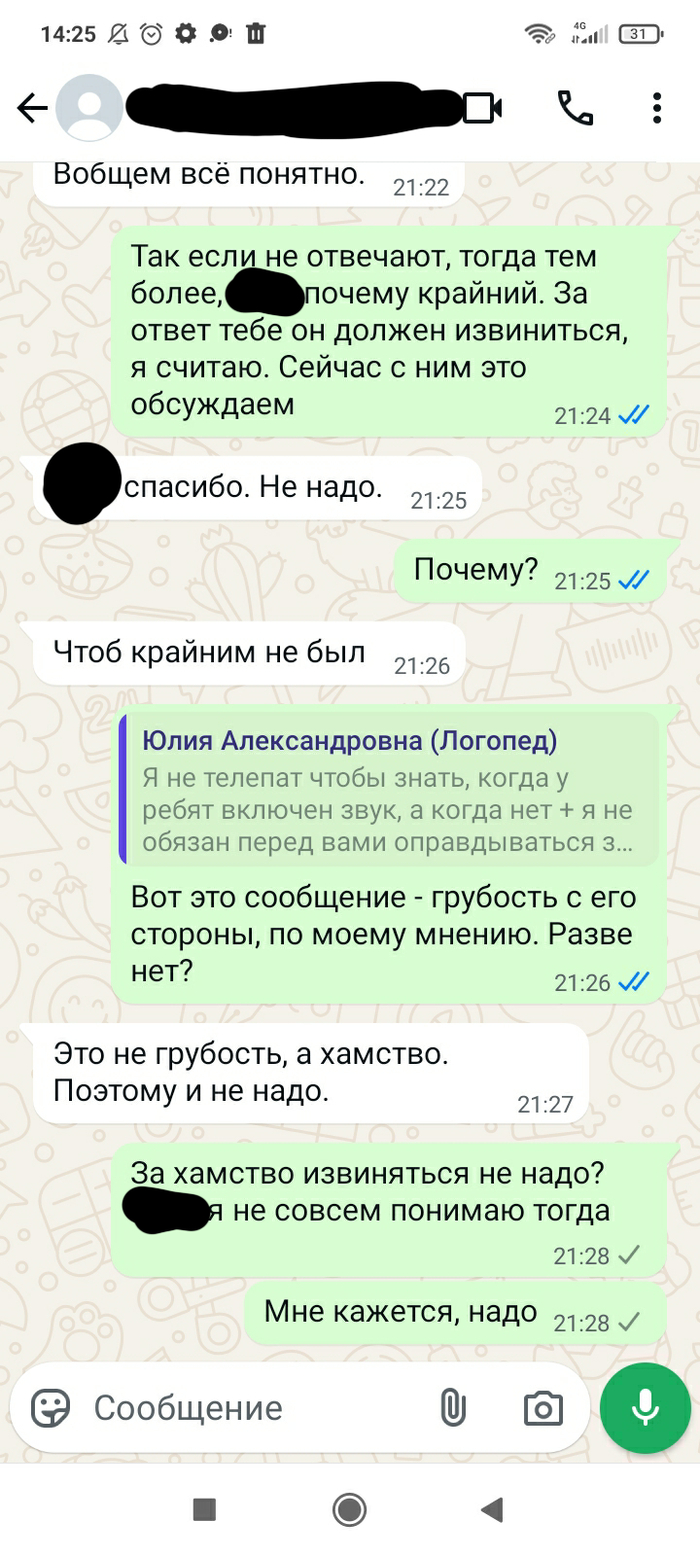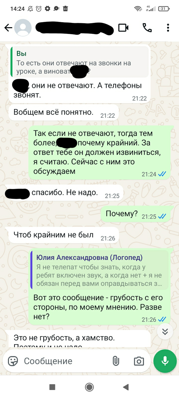 После этого диалога русичка заблокировала мою маму и меня в ватсаппе, не захотя отвечать на вопрос, почему я крайний.