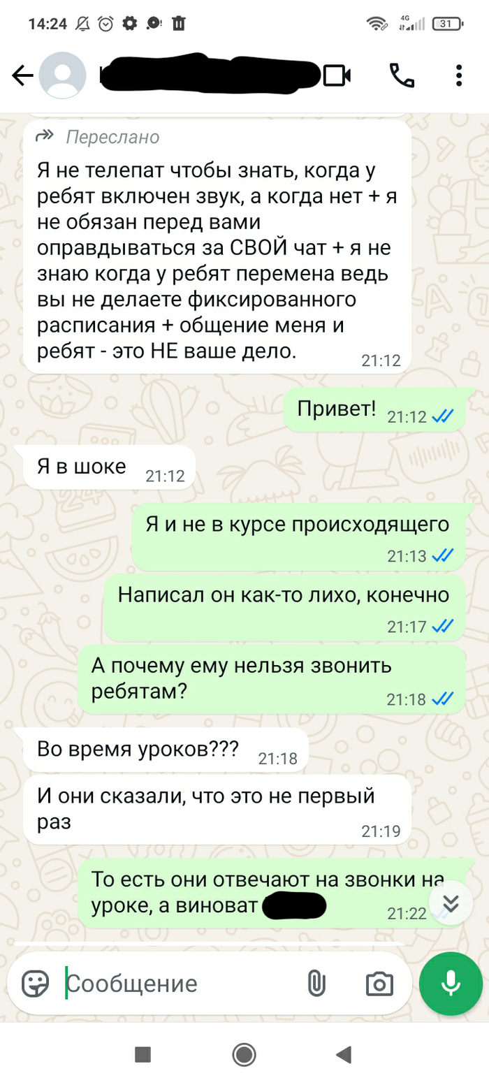 Ну вот, рассказав всё необходимое, начнём. В 13:40 (в это время не известно, перемена или урок) или около того, в будни, я звоню в «клуб крутых анонимусов» в надежде, что мне ответит Петя, ведь в это время он обычно свободен. Петя мне ответил, а вот от русички приходит сообщение в личку, с похожим содержанием: "Ещё раз позвонишь или напишешь детям, я пожалуюсь папе". Но говорив с Петей, я забил на это. В один грустный вечер воскресеньем (когда я просрал 50 рублей в автомате с кофе) я вспомнил об этом сообщении, и ответил вот так: "Я не телепат, чтобы знать, включен у ребят звук или нет + я не обязан оправдываться перед вами за мой чат + общение меня и ребят это НЕ ваше дело + вы не делаете фиксированного расписания, и я не знаю, когда можно позвонить". Сразу же это сообщение прилетает маме, и там появляется следующий диалог: