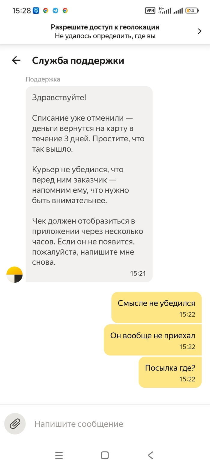 • 18-19 января: Поддержка подтверждает, что заказ был передан курьерской службе, несмотря на отмену. При этом они заявляют, что «ответа от сотрудников курьерской службы пока нет» и просят подождать еще 3 дня.