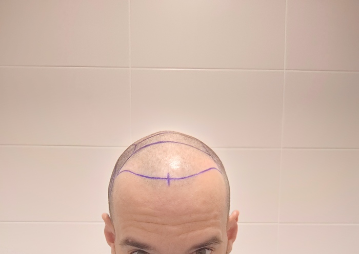 Меня побрили, Али разметил зоны из которых будут брать волосы и в которые будут пересаживать.