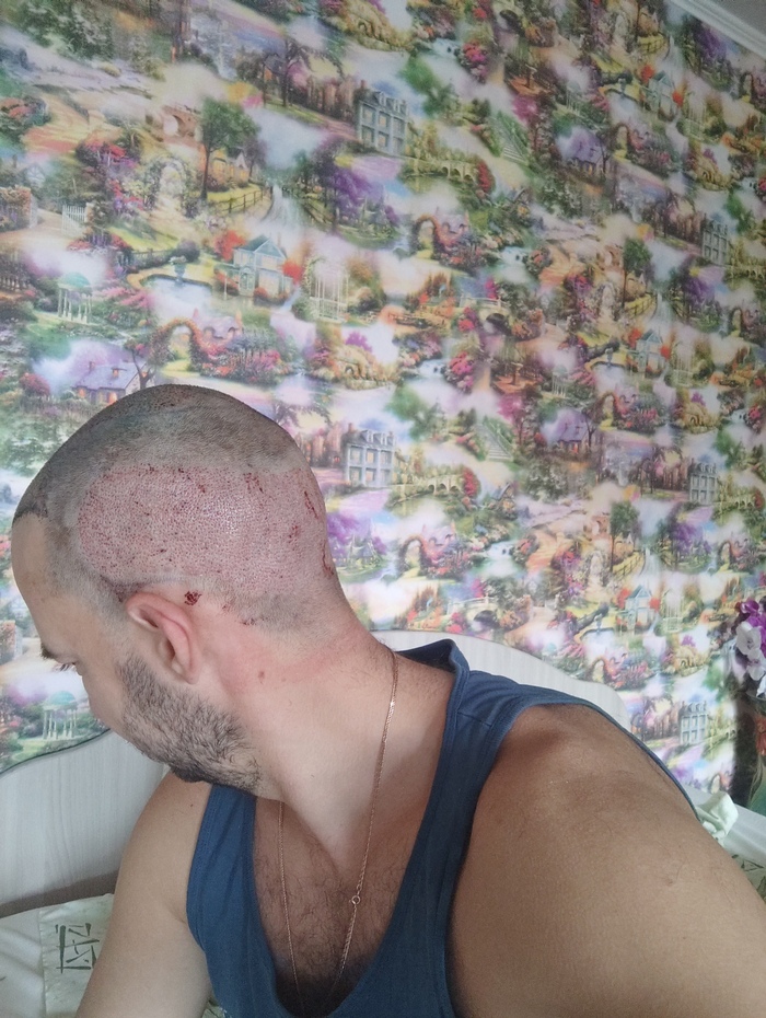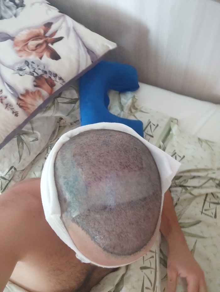 В аэропорту я конечно приковал всеобщее внимание, выглядит голова после операции не очень аппетитно, плюс надо было быть очень аккуратным, пересаженные волосы ничем не закреплены и любое неудачное движение, и операция уже будет не столь успешной. По этой же причине первую неделю надо спать на специальной подушке. Спать на этой подушке у меня не получалось, поэтому неделю я не спал, а лежал в полудреме и в тревоге.