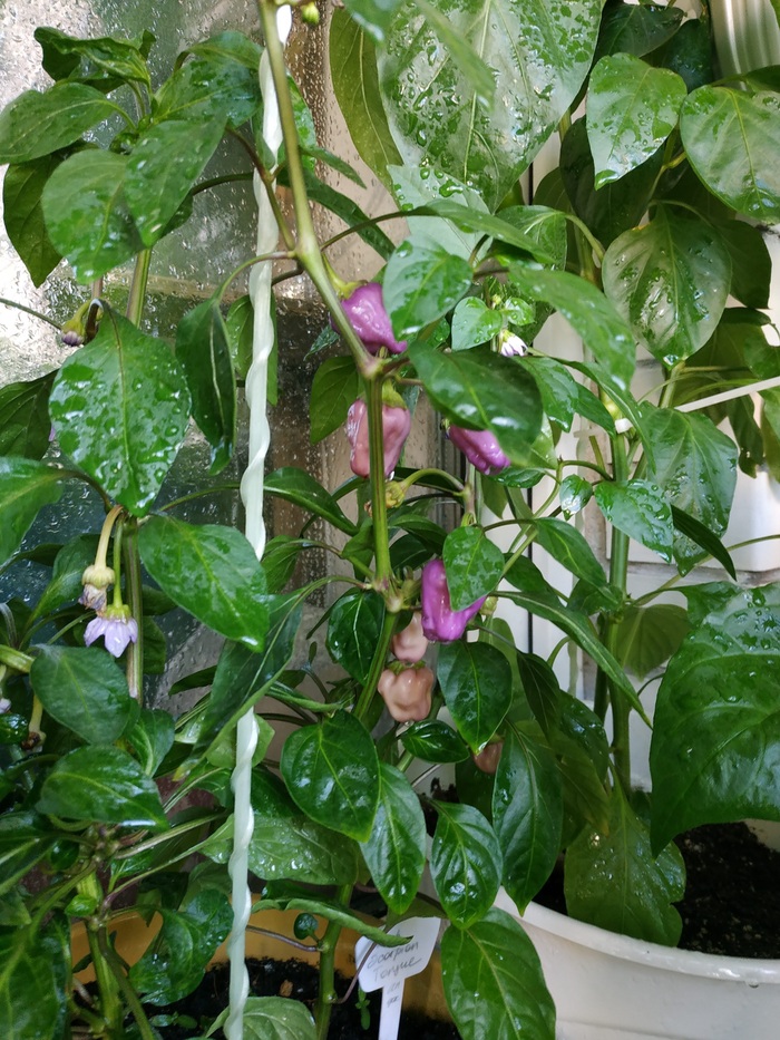 Ещё очень мне понравился как декоративный Black Scorpion tongue. Цветёт красивыми фиолетовыми большими цветами, перцы перерастают из одного цвета в другой. Достаточно острый, его "яблочного" привкуса я не заметила.
