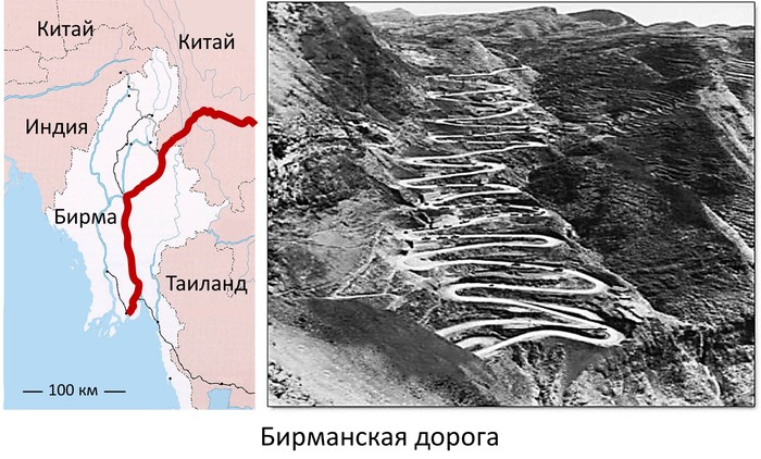Основной маршрут был через Французский Индокитай (нынешние Вьетнам, Лаос и Камбоджа). После оккупации Франции Гитлером в 1940 Япония ввела войска в Индокитай. Снабжение Китая оборвалось. Но англичане начали поставки Чан Кайши через Бирму. По горной дороге пошёл поток грузовиков.