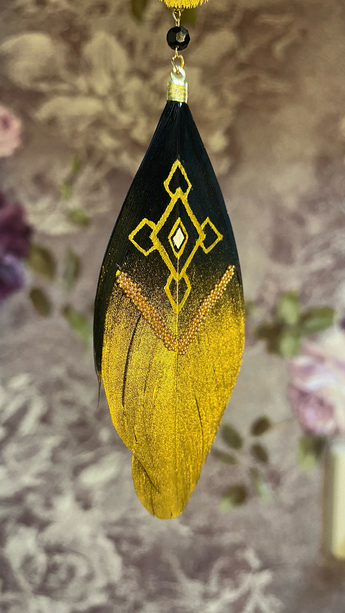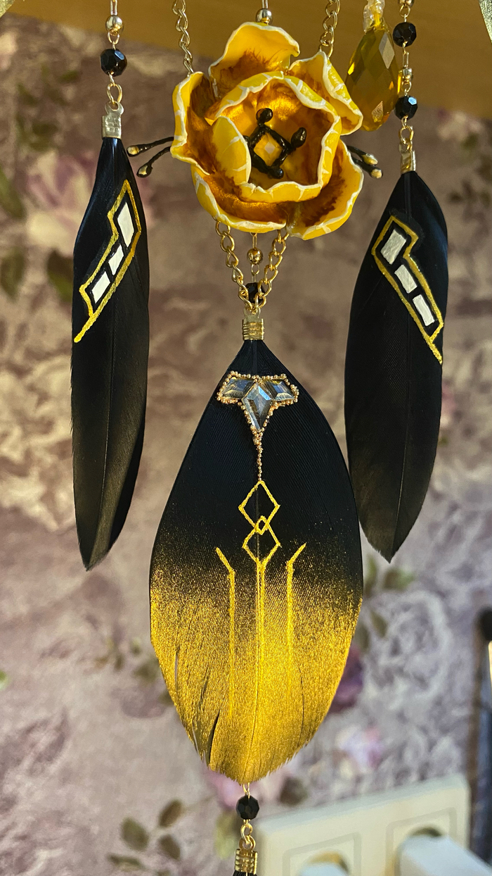Небольшое пояснение: на перьях представлены узоры с его обличия архонта (узоры на руках и одежде, включая капюшон), по краям слеплены крохотные цветы из гео сета, а именно цветок архаичный камень. По краям основы золотая крошка, напоминающая ценный минерал из Ли Юэ кор-ляпис, ну и сама цветовая гамма была выполнена и выдержанна именно по персонажу.