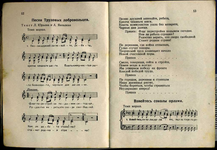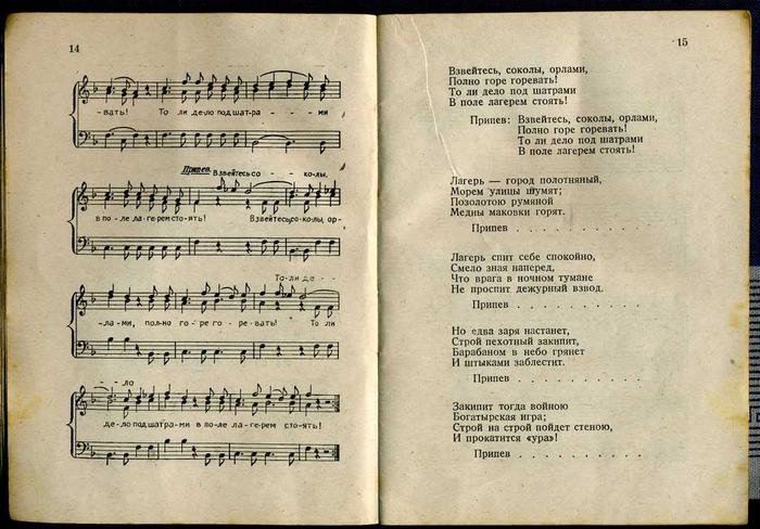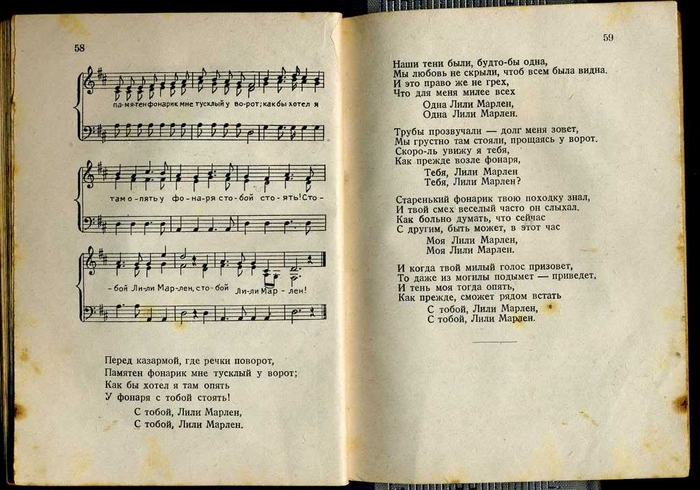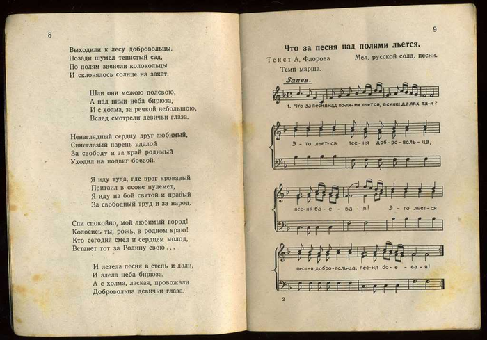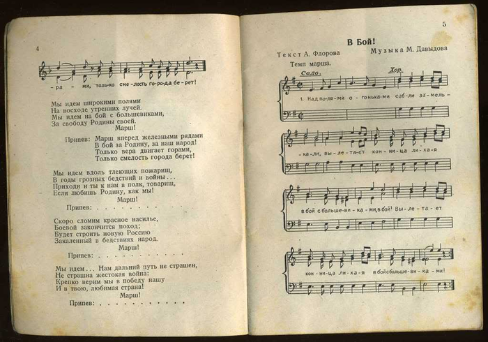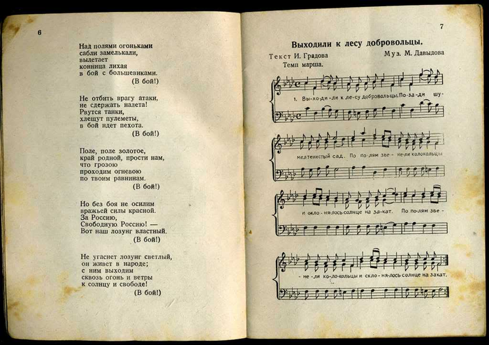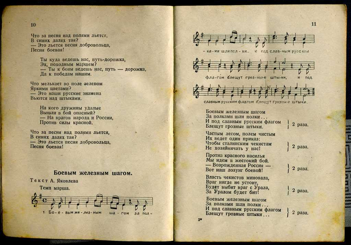 Составителем песенника стал предположительно Анатолий Флауме (1912 - 1989). Под псевдонимом Флоров он написал ряд текстов песен РОА, самой известной из которых стала "Мы идем широкими полями ...". До войны Флауме был учителем русского языка в Риге, а после того, как Прибалтика была оккупирована немцами, активно сотрудничал с новыми властями - выпускал сборники стихов, учебники русского языка, работал штатным пропагандистом. После войны ему удалось скрыться во французской зоне оккупации Германии, где он вернулся к довоенной специальности преподавателя русского языка. С 1951 года преподовательской деятельностью он занимался уже в Соединенных Штатах. Был активным членом эммигрантской организации НТС (Народно-трудовой союз). Его песня "Мы идем широкими полями ..." и в наши дни пользуется популярностью среди современных поклонников Власова. Сборник, предлагаемый вашему вниманию, разбит на три раздела - новые песни, написанные специально "под РОА", старые солдатские песни царских времен и самые известные народные песни. Завершает сборник сравнительно неплохой перевод "Лили Марлен" - одной из самых известных военных песен двадцатого столетия.
