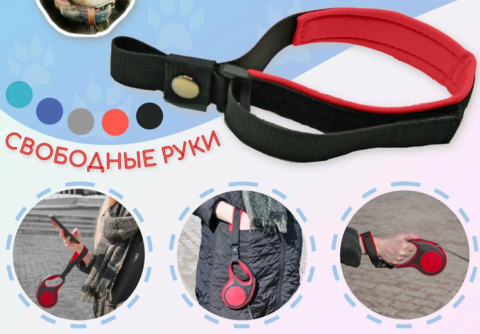 Некоторые для подстраховки накидывают дополнительную петлю на запястье, чтобы иметь возможность хотя бы на время отпустить основную петлю поводка или ручку рулетки, чтобы сползать в карман за носовым платком или телефоном.