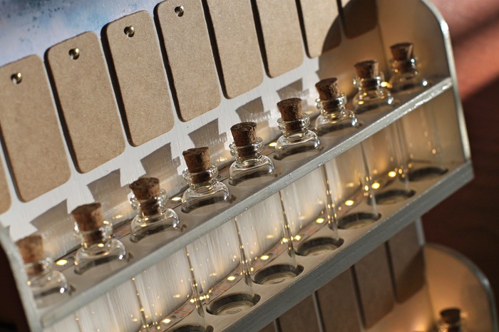 Всем привет. Сезон отпусков почти закончился, многие вернулись или возвращаются с морей. Везут сувениры, экзотические фрукты, магниты, ковры и шубы. А кто то везет песок в свою коллекцию. Вот для такого путешественника и была сделана данная полка на 40 бутылок с подсветкой.