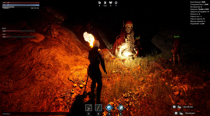 Интерактивность игрового мира: взаимодействие с мобами, NPC и объектами. Можно разжигать кузницы, сидеть на лавках, зажигать и тушить факелы, готовить еду у костра;
