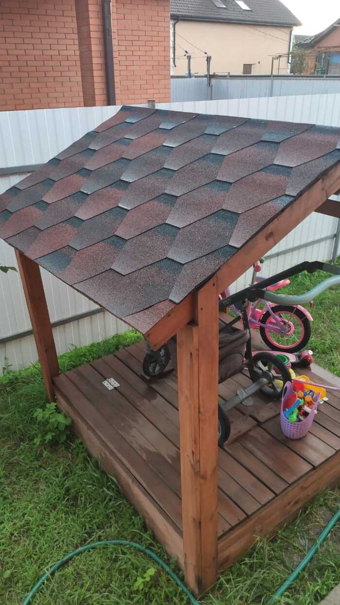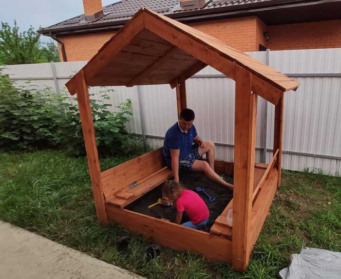 Потом мягкой черепицей застрелил, чтобы дождь не мочил. Песочница в основном использовалась как навес, чтобы коляски не мокли. Когда навес во дворе сделали, песочницу убрали.