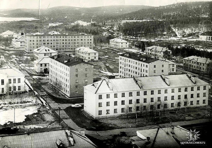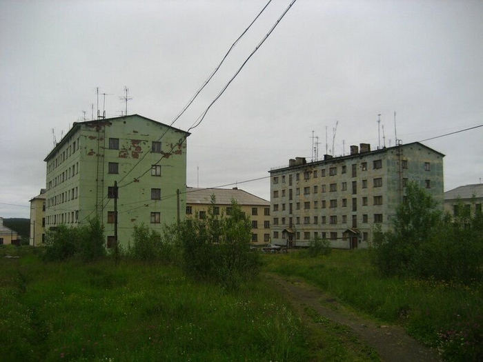 Фото с сайта администрации Кольского района, дата неизвестна. Кадр сделан со стороны жилого дома на ул. Ткачева. На фото видно показанный выше двор на ул. Октябрьской (все дома на фото уже заброшены).