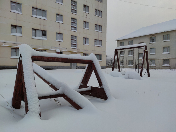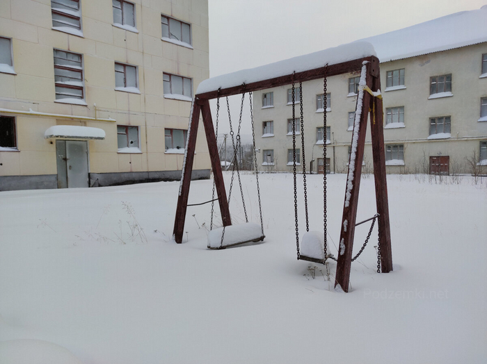 Детская площадка, за ней между домами виднеется котельная. Песчаный начали строить в 1960х, так что эта площадка может здесь стоять с первых дней существования поселка.