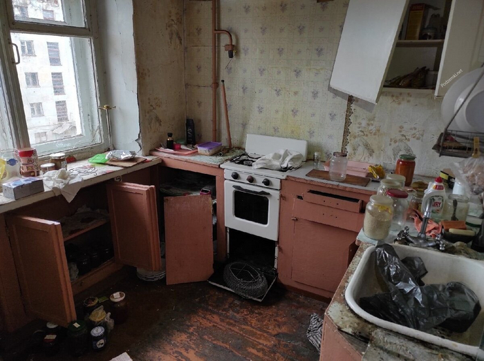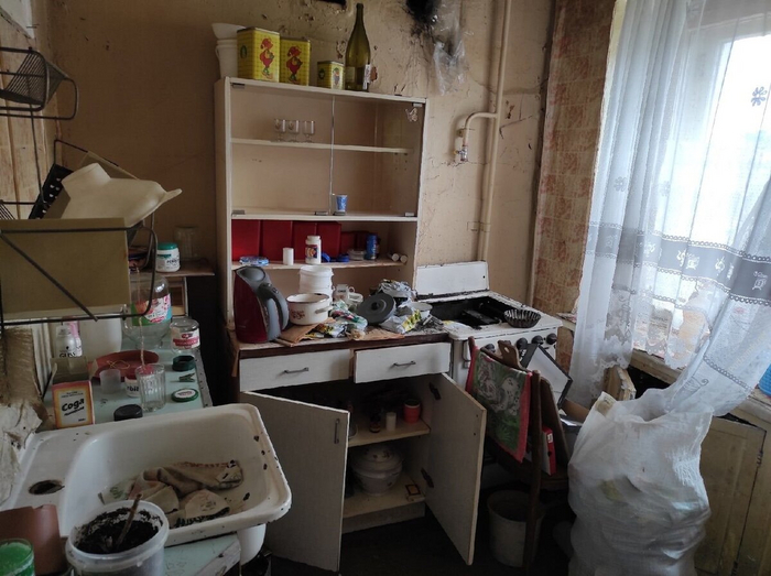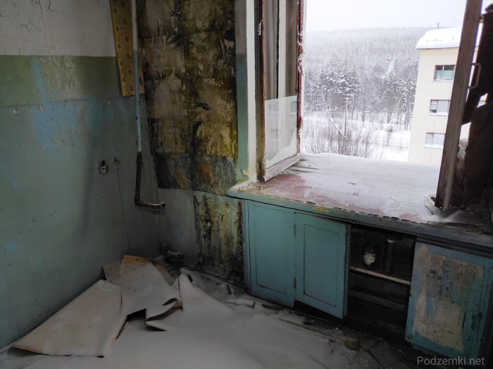 Но есть и квартиры, которые пострадали от мародеров и непогоды. На этой кухне ветром открыло окна, из-за чего внутри все усыпано снегом.