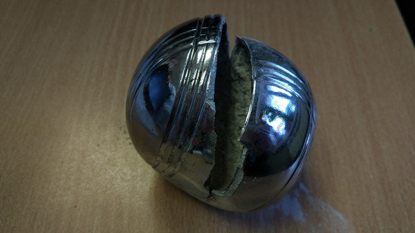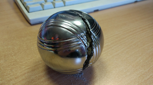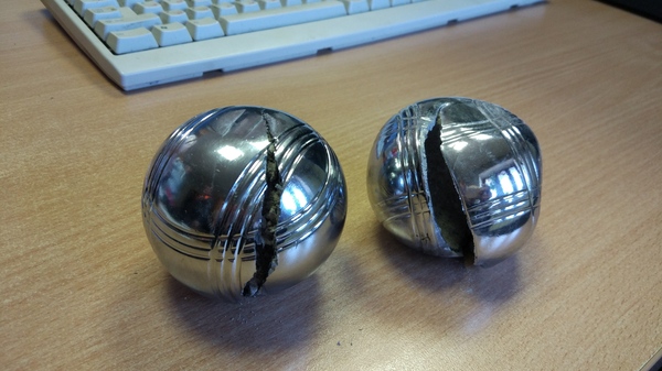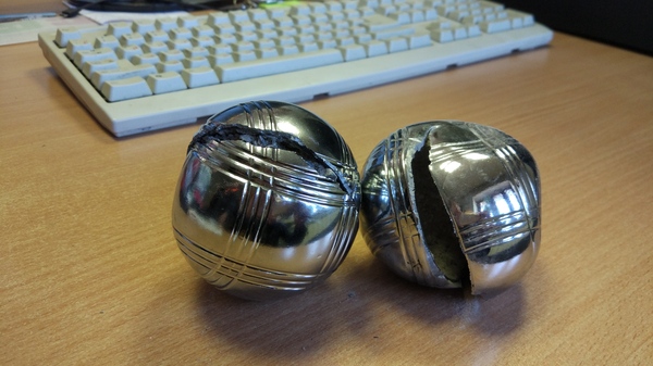 Слесарная обработка шаров оказалась весёлым занятием. Второй шар разрушать не буду, поищу ему применение. Спасибо за развлекуху, Мосигра)