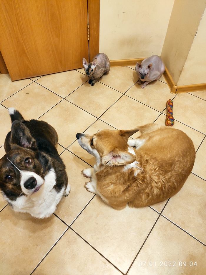 Все хвастаются своими питомцами, вот и наша банда, пемброк - Дрима, кардиган - Чуня, петерболд - Пицца и дончак Суши