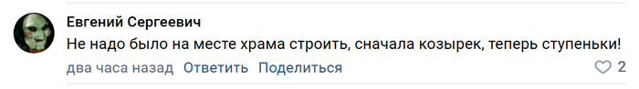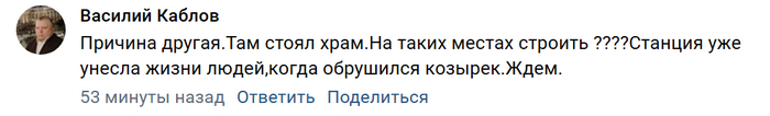 Как вы думаете, в чём причина? Халатность строителей, устаревание материалов? Погода, химикаты? А вот отдельные жители Петербурга готовы поделиться версией. По их менению, причина сегодняшнего происшествия и обрушения козырька павильона в 1999 году (7 погибших) — храм. Точнее — строительство станции на месте храма.