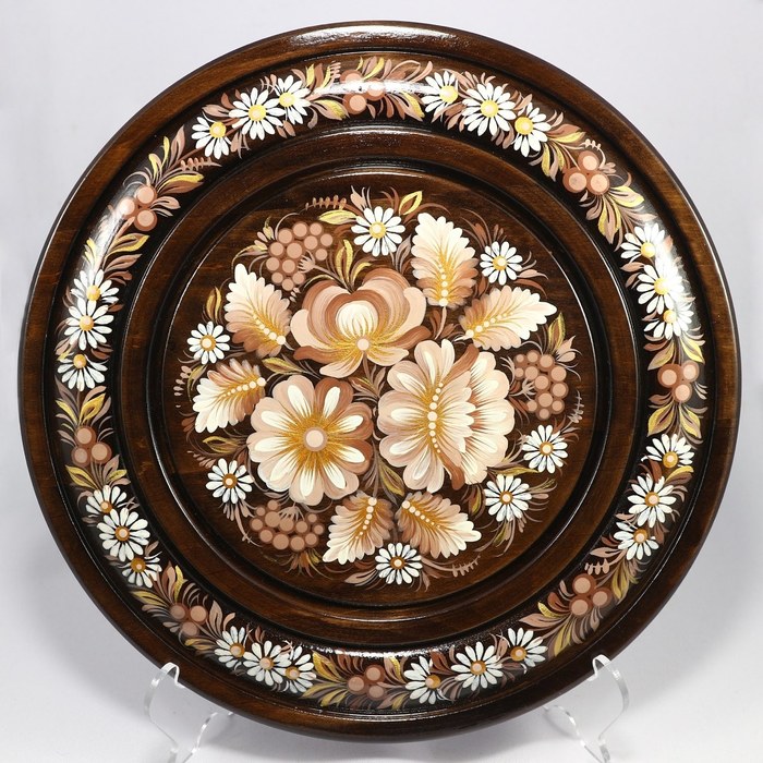 На предыдущих тарелках фон делала акриловыми красками. На этой тарелке мне понравилась текстура дерева, я решила ее немного подчеркнуть морилкой. Я очень люблю зарисовывать все свободное место росписью, в этот раз я старалась держать себя в руках)