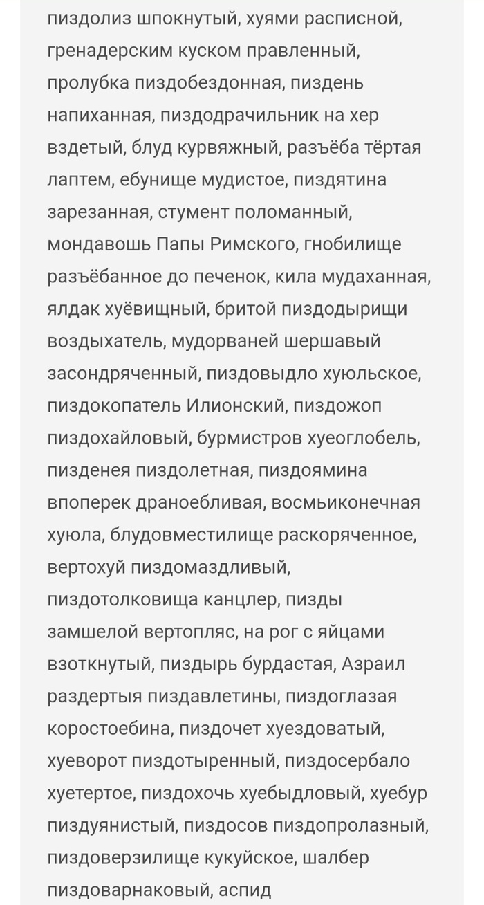 Распроебалина хуевая, зело разъебанный до требухи пиздодыры вселенской хуеглот яко драченый фараонов уд, промудохуеблядская пиздопроебина, архиерейская залупа, пендряченный Иерихонския пиздищи елдачина, зарубка Алексашковой мотни, блудоебливый афедрон, еьаный Приаповой дубиной стоеросовой, Вавилонския блудницы выблядок, ебливой суки выпердеж, мудила отхуяренный, пиздоебательной пиздины пиздорванец охуелый, кляп вздыбленный, еблище пиздопорванное обвислого хуищи, ебатель раскоряченный манды, хуилово, ебилово, пиздилово, торчилово, крещеное шматиной лейбгвардейского полка, ебаное ежом косматым против шерсти волосатым, ебихуй царя небесного, шмариганная ненаеба, опиздряченная пыпла широкопиздой матери козлоебень, московские заборы проебавший.