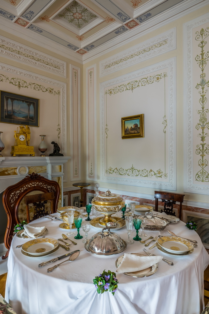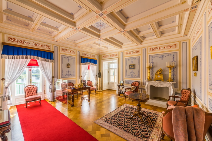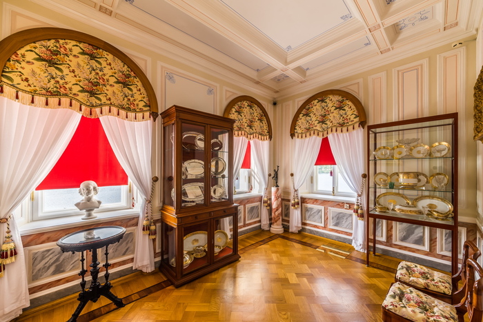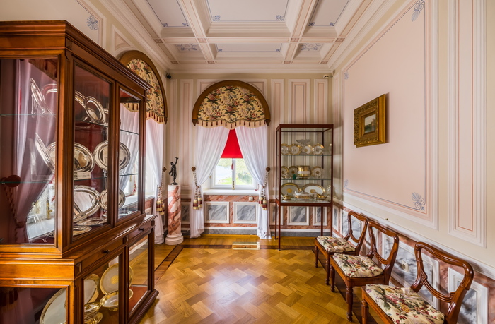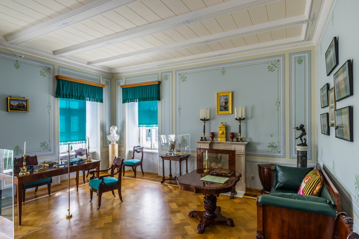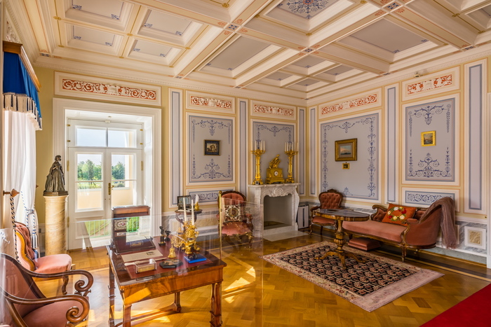 Пейзажи "страны грёз" украшают и Кабинет Ольги Николаевны, оформленный без лишней помпезности – дочери Николая I воспитывались в спартанской простоте. На рабочем столе Кабинета письменные принадлежности, среди которых мозаичный пресс с изображением сицилийского герба. На отдельном столике шкатулка для рукоделия. Царские дочери хорошо вышивали, кроме того, они умели музицировать, их обучали рисованию, пению, танцам, верховой езде.