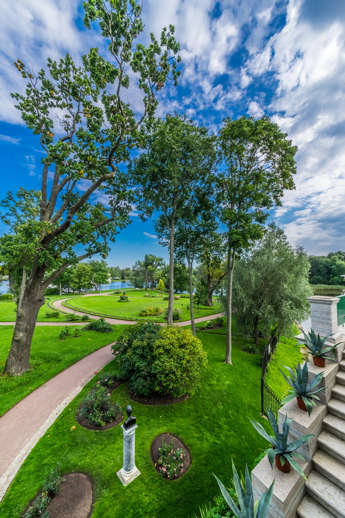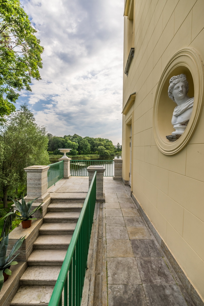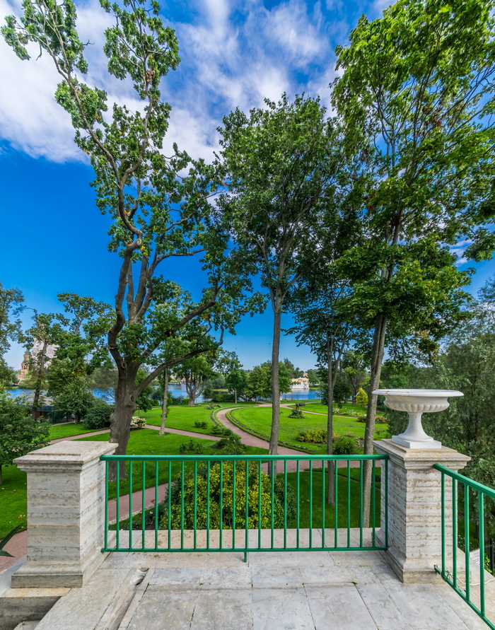 С верхней террасы павильона открывается прекрасный вид на Петергоф и его окрестности. Отсюда просматривается Бельведер, напоминающий древнегреческий храм, и пятиглавая церковь Благоверной царицы Александры, построенные на Бабигонской возвышенности архитектором А. И. Штакеншнейдером по указу Николая I, для которого Петергоф всегда был любимым местом летнего отдыха.