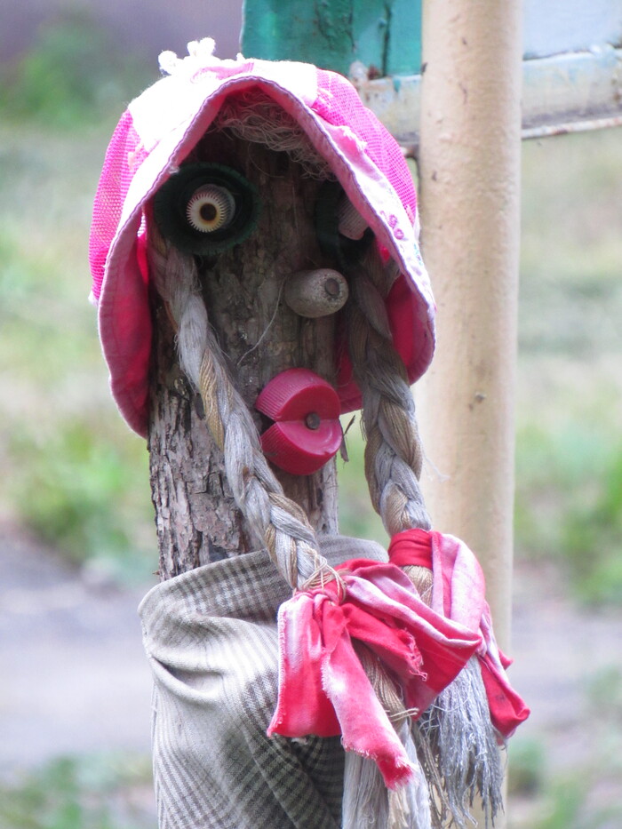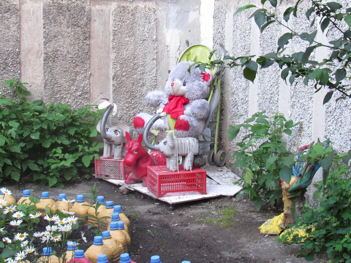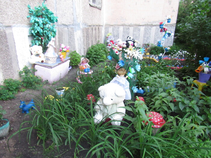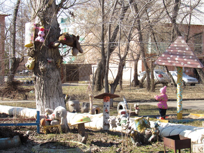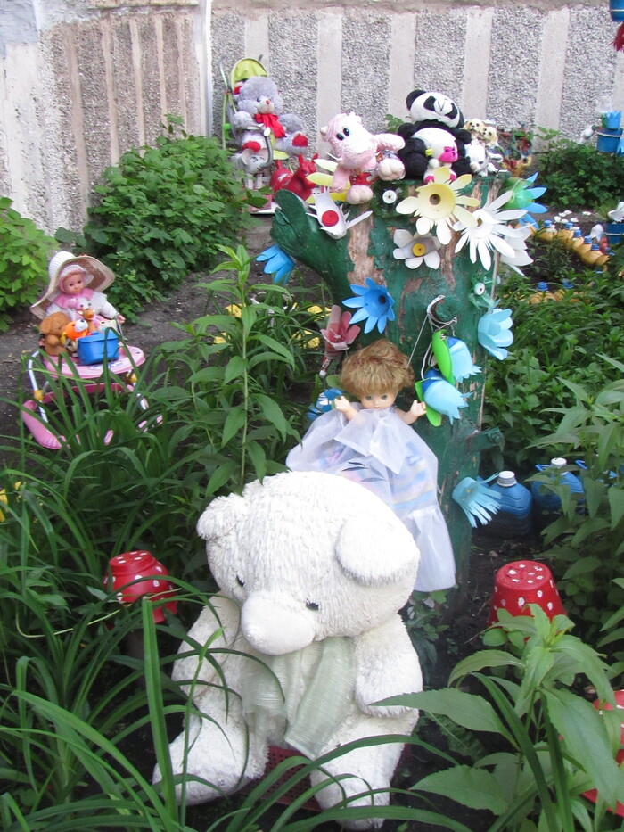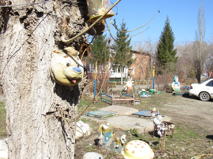 Когда жил в Омске, часто такое видел. Например во дворе дома №26 на улице Осминина была очень мрачная коллекция игрушек.