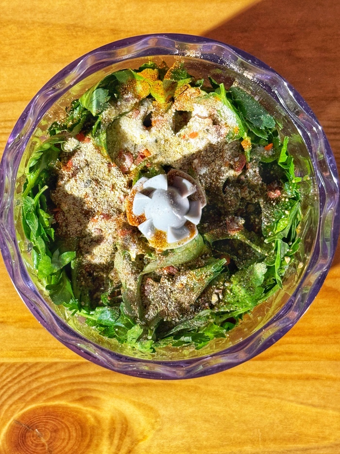 Главное — заранее отделить листья петрушки от стеблей, чтобы вкус получился максимально свежим и насыщенным. После этого просто отправьте все ингредиенты в блендер.