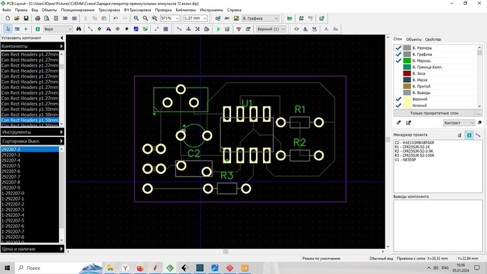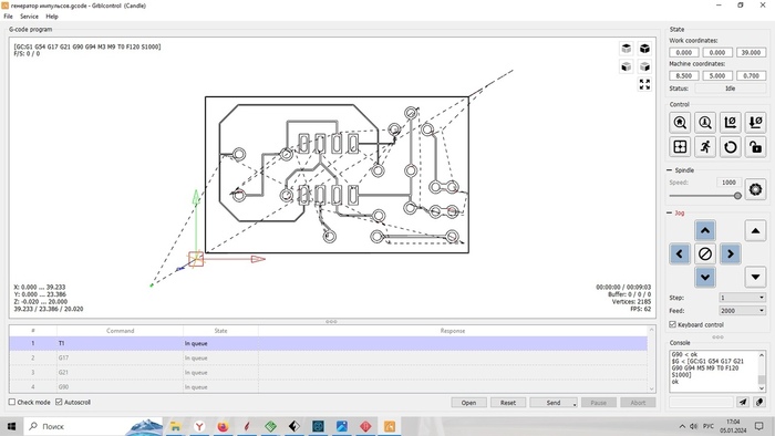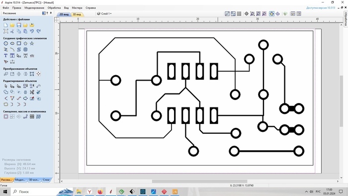Печатную плату, можно сделать самыми разными способами, нарисовать/вырезать вручную, использовать трафареты или применить фоторезист с последующим травлением, награвировать ЧПУ станком, воспользоваться лазерноутюжной технологией. В моём случае был применён лазер на станке CNC3018. Что бы создать плату с помощью не очень мощного лазера, необходимо закрасить медную поверхность платы, любой тёмной краской, желательно аэрозольной, для более равномерного покрытия. Подготавливаем файл для гравировки лазером, с помощью любой доступной программы и гравируем, а точнее сжигаем краску, в нужных местах, после прожига, смываем сажу, что бы медь была чистой, травим в хлорном железе или других растворах для травления печатных плат. Получилось не хуже, если делать с фоторезистом.