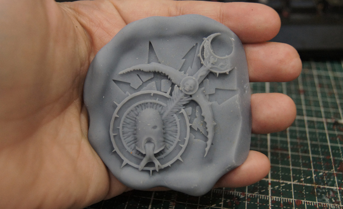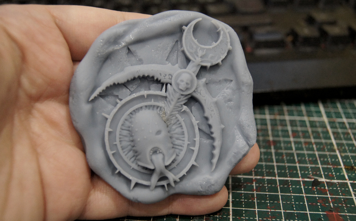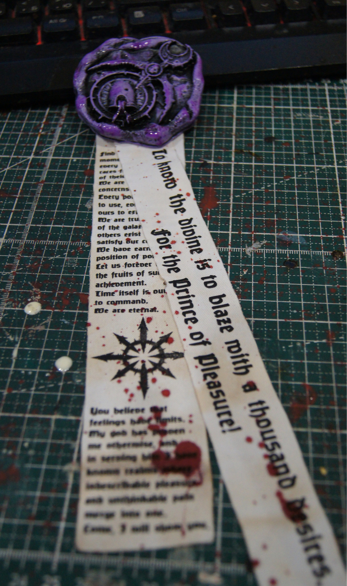 Отливка, покрас (цвет хотела взять темнее, но увы он не очень смотрелся на черной подложке), литании я уже заранее заказала с прошлой партией DFT печати. Получилась вот такая хаоситская печать.