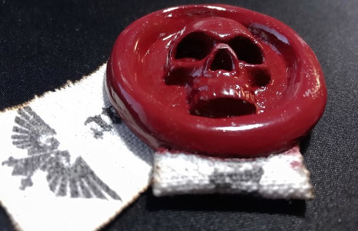 Но после размышлений и проб был выбран более бордовый, глянцевый оттенок, печать окрашивалась кистью, в дальнейшем будет использоваться аэрограф, он дает более равномерный слой. После покраски модель была покрыта акриловым лаком. Да, сначала показалось, что очень блестит, возможно в будущем к глянцевому лаку надо будет добавлять матирующий состав, хотя с другой стороны во вселенной WH 40k после нанесения печати её покрывают защитным герметиком, кто знает, может он и давал бы такой блеск.