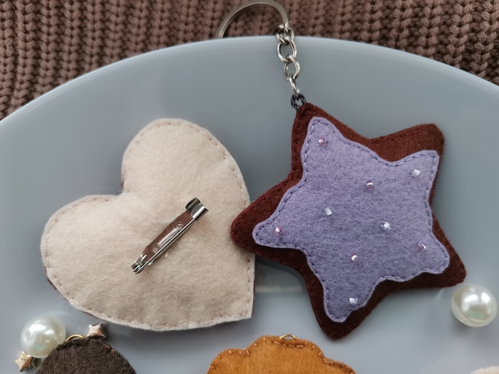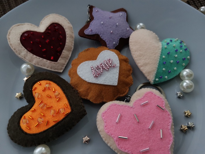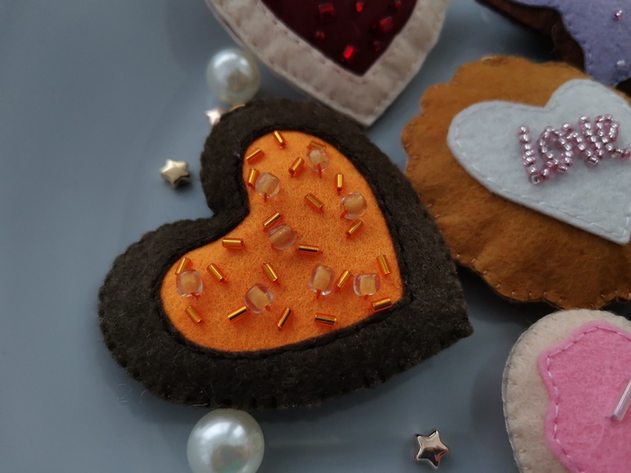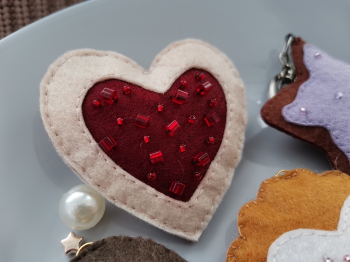 У всех печенек есть крепление для цепочки, кроме печеньки с вишневым бисером, на ней пришита булавка. Хотелось попробовать разные варианты для ношения.