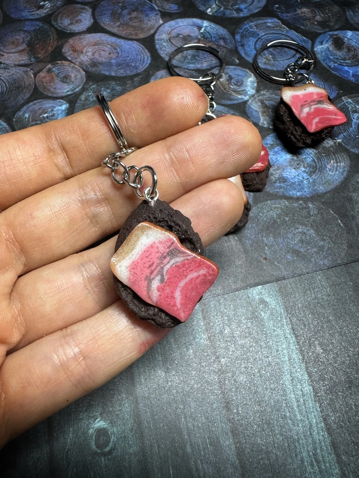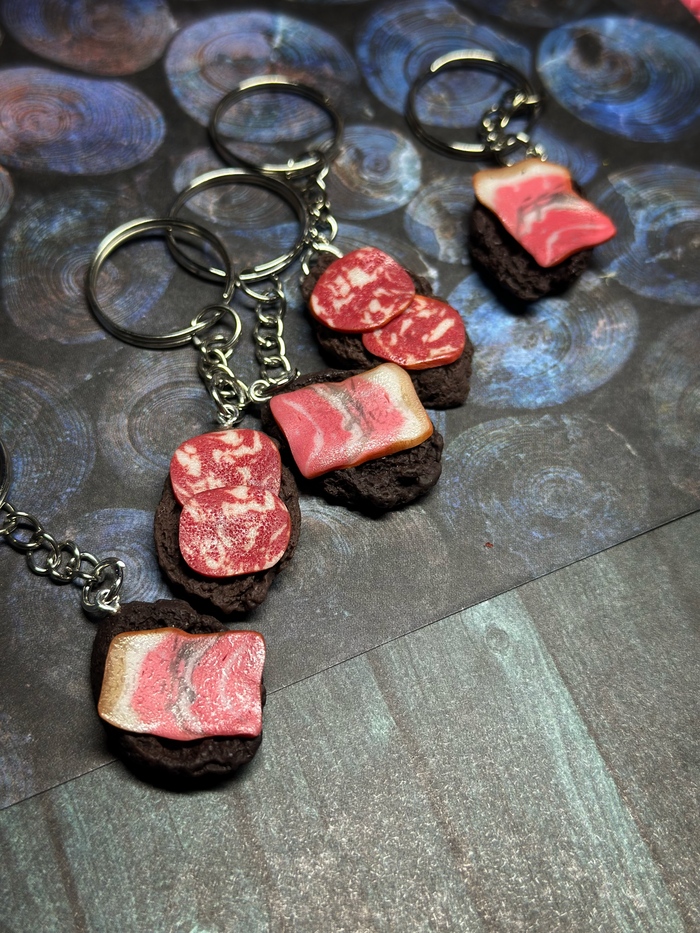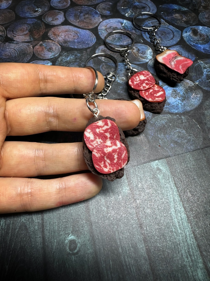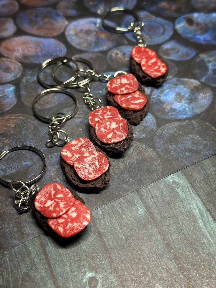 Этот брелок - порция отличного настроения на каждый день. Воссозданная текстура свежего бородинского хлеба и нежные прожилки бекона, колбаски, что его хочется попробовать на вкус.
